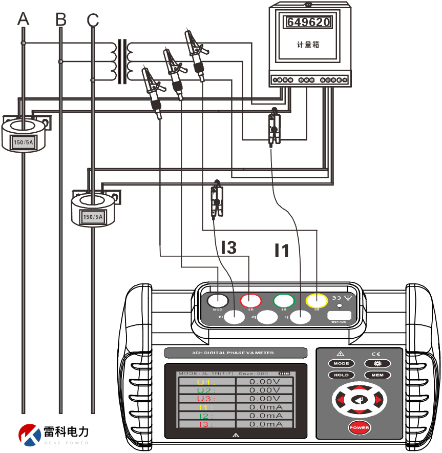 Reke2020三相交流電壓表電流、電壓間相位、電流間相位、電壓電流間相位、頻率、有功功率、無(wú)功功率、視在功率、功率因數(shù)、三相電流矢量和,判別相序、感性、容性電路等。測(cè)試接線如下: