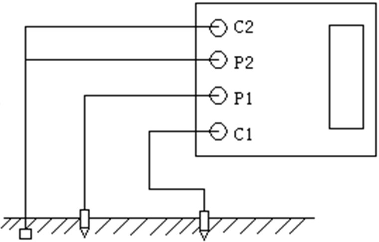 1、測量保護(hù)接地電阻時(shí),一定要斷開電氣設(shè)備與電源連接點(diǎn)。在測量小于1Ω的接地電阻時(shí),應(yīng)分別用專用導(dǎo)線連在接地體上,C2在外側(cè)P2在內(nèi)側(cè)(如下圖)所示: